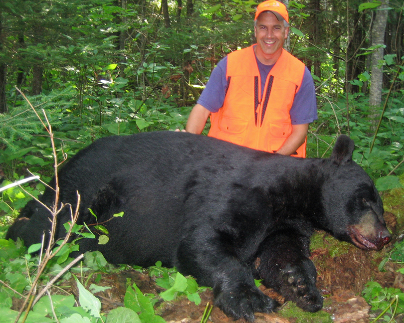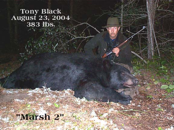 "August 2004 was my first trip to Larsson's Camp. Two of my friends had hunted there in 2003 and had such a good time that we all decided to come back together. On the second afternoon of my hunt I took a very nice 383 lb. black bear. Its hide was in perfect shape. The Dutka's run a very good camp (lodge). I was impressed with the quality care given to the hide and bear meat. The cabins are nice, and the food is excellent. The girls are great cooks! I had a very good hunt, and after I got my bear I filmed and took pictures of other bears, and caught some Northern Pike on Caliper Lake. 3 fish fed 10 people! I will be coming back in 2005 for another fun time at Larsson's Camp." TONY BLACK, AUGUST 2004.